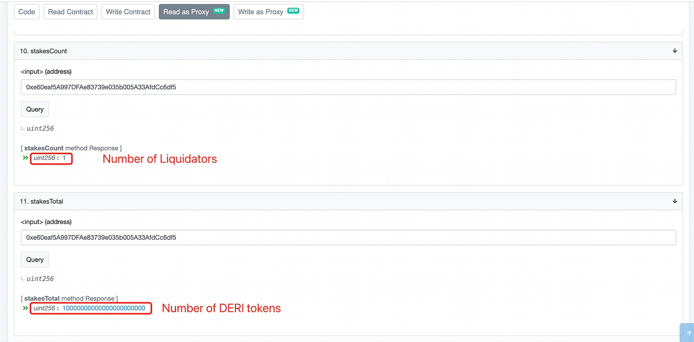 Step 2. You can find the number of DERI tokens and qualified liquidators on BSCscan. The average staking amount = Number of DERI tokens/Number of Liquidators.