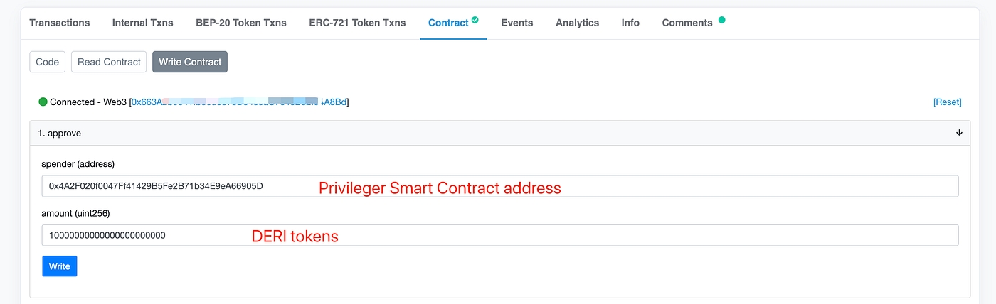Step 1: Approve Privileger smart contract in DERI token smart contract (https://bscscan.com/address/0xe60eaf5A997DFAe83739e035b005A33AfdCc6df5#writeContract)